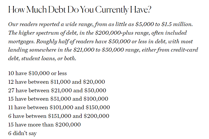 該網(wǎng)站針對102名讀者就個人債務(wù)問題進行了調(diào)查,了解他們?nèi)绾伪池?fù)和償還債務(wù)。調(diào)查發(fā)現(xiàn),個人債務(wù)總額從5000美元到150萬美元不等,20萬美元以上的債務(wù)通常包含抵押貸款。約半數(shù)受訪者的債務(wù)在5萬美元及以下,最常見的債務(wù)范圍在2.1萬美元至5萬美元之間。