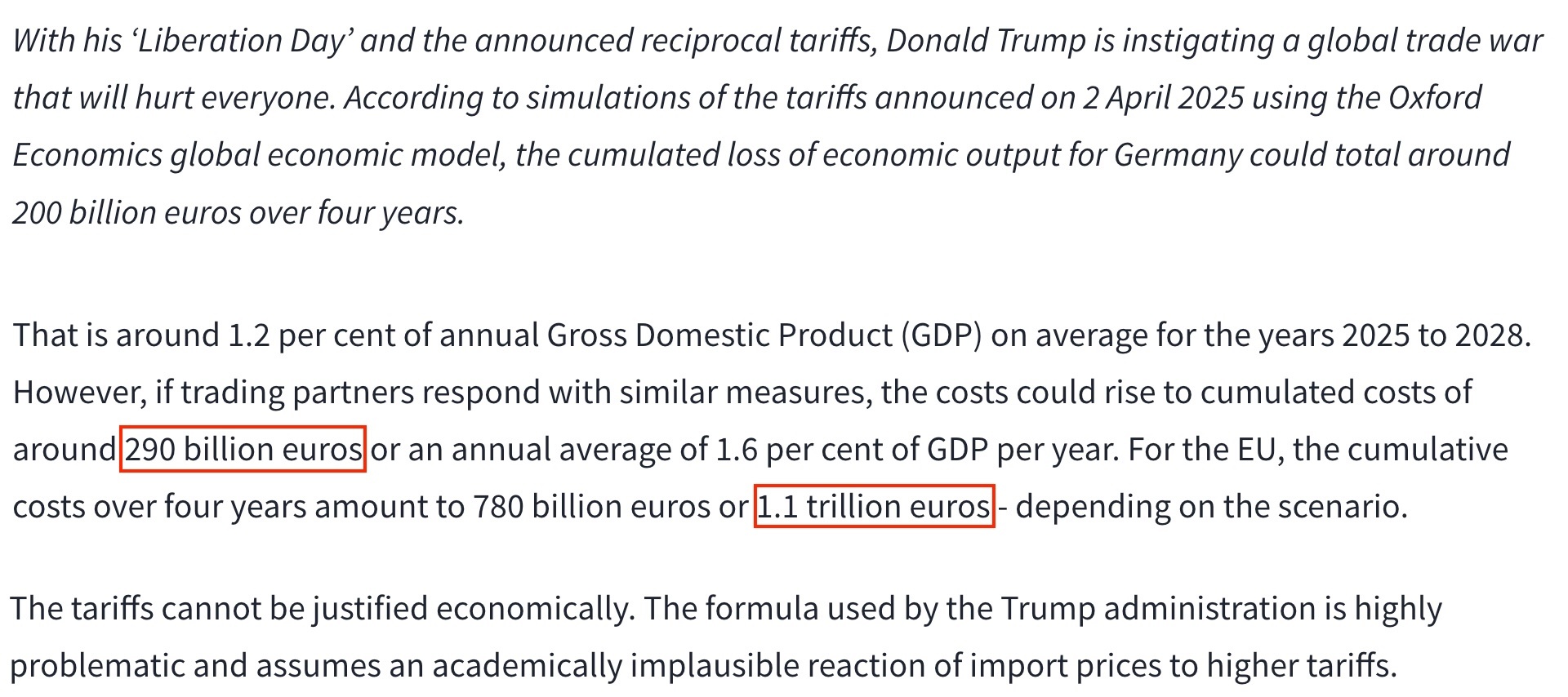 德國經(jīng)濟研究所日前發(fā)布的研究報告顯示,未來四年內(nèi),美國“對等關稅”措施可能令歐盟損失1.1萬億歐元,僅德國就將損失2900億歐元。