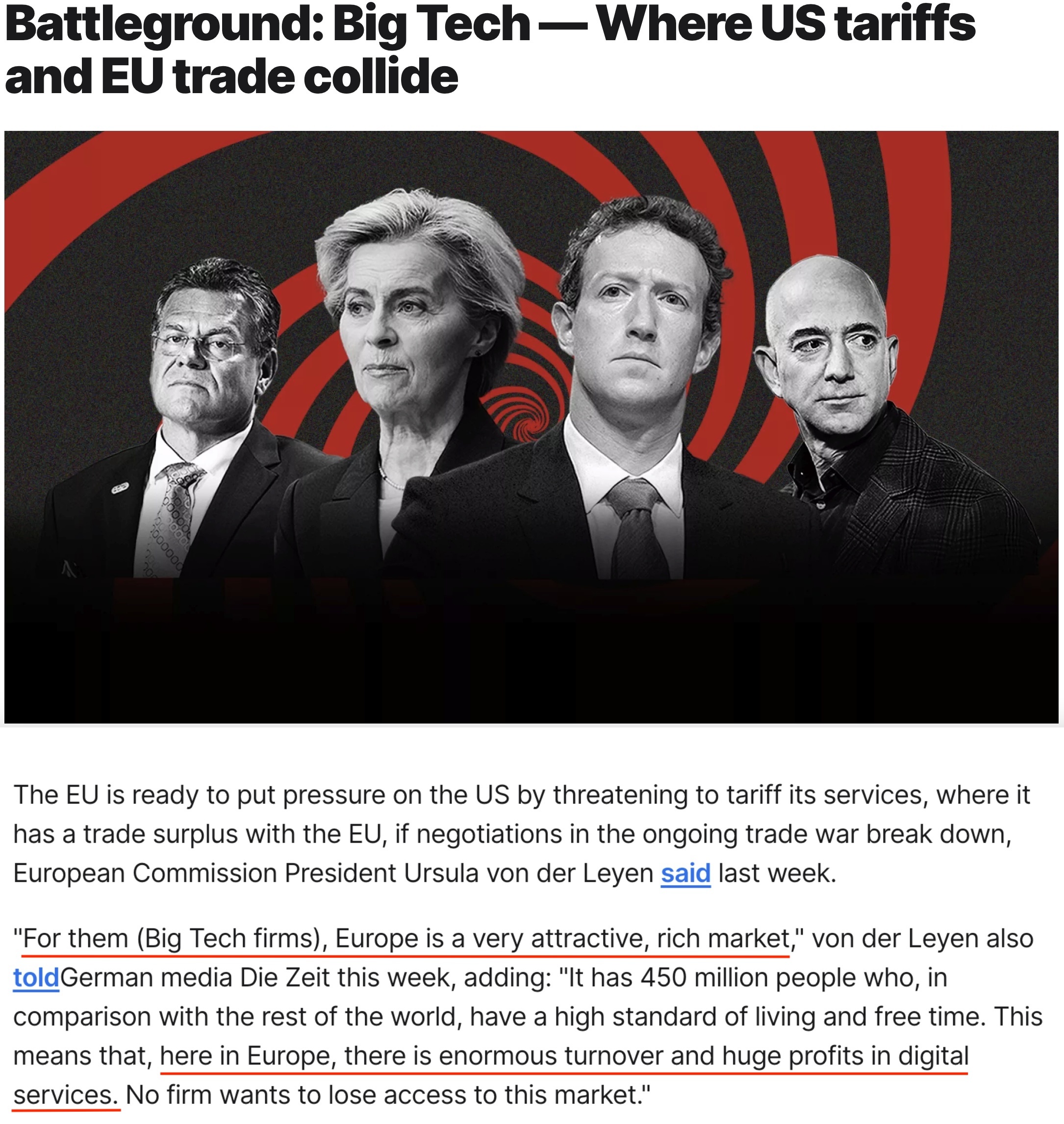 歐盟委員會主席馮德萊恩近日接受歐洲媒體采訪時表示,如果與美國的談判無法讓其取消對歐關稅,歐盟準備動用“最有力的貿(mào)易措施”將大西洋兩岸的貿(mào)易戰(zhàn)擴大到服務領域,包括對美國大型科技公司的數(shù)字廣告收入征稅、限制美國公司參與歐盟公共采購項目等。