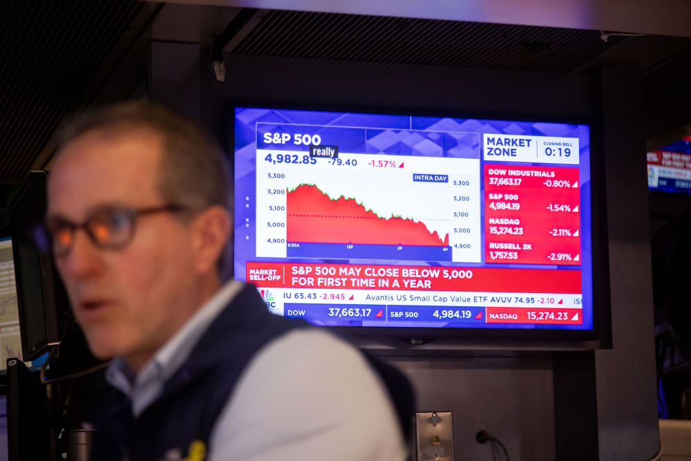 4月8日,交易員在美國紐約證券交易所交易大廳工作。紐約股市三大股指當天下跌。新華社發(fā)(郭克攝)