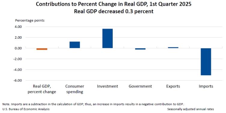 4月30日,美國商務(wù)部公布了2025年美國一季度經(jīng)濟數(shù)據(jù),美國一季度國內(nèi)生產(chǎn)總值環(huán)比(按年率計算)萎縮0.3%,為三年來首次負(fù)增長。