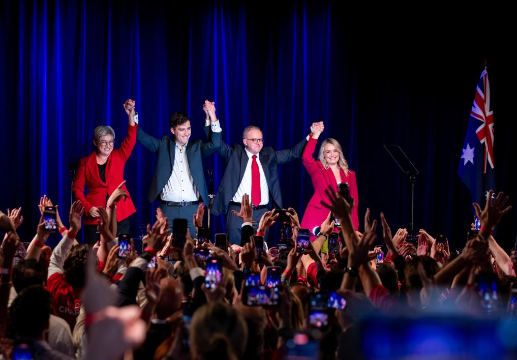 5月3日,在澳大利亞悉尼,澳大利亞總理阿爾巴尼斯(右二)與澳大利亞外長(zhǎng)黃英賢(左一)在競(jìng)選集會(huì)上慶祝勝利。新華社記者馬平攝