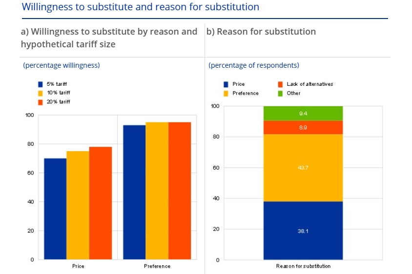 歐洲央行在4月底的博文中還提到,通常情況下,關(guān)稅對消費者的影響程度取決于受影響產(chǎn)品和服務(wù)的需求價格彈性,即如果價格上漲,消費者可能會轉(zhuǎn)向更便宜的替代品。然而,近期美國的關(guān)稅可能會導(dǎo)致更廣泛的偏好轉(zhuǎn)變,使歐洲人完全放棄美國產(chǎn)品和品牌,不論價格如何變化。