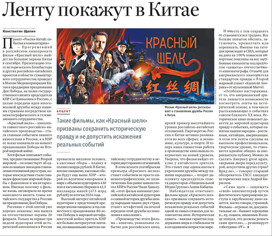 當?shù)貢r間5月7日,俄羅斯政府機關(guān)報《俄羅斯報》刊發(fā)題為《中俄合拍電影〈紅絲綢〉將在中國上映》的評論文章。文章指出,在俄羅斯紀念蘇聯(lián)偉大衛(wèi)國戰(zhàn)爭勝利80周年前夕,在中國國家主席習近平應邀對俄羅斯進行國事訪問之際,中國中央廣播電視總臺將在莫斯科舉辦中俄合拍電影《紅絲綢》及其他中俄人文合作項目的推介活動,通過影視交流合作傳遞中俄世代友好。文章援引專家觀點強調(diào),電影《紅絲綢》肩負著守護歷史真相的使命,防止人類至暗時刻的歷史被篡改。