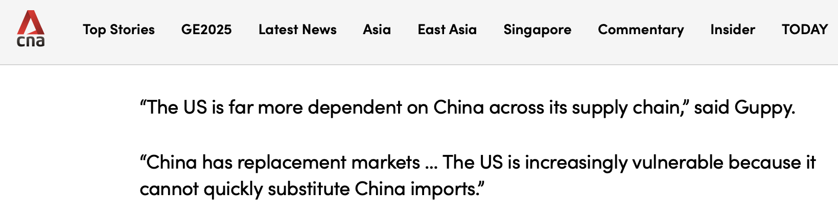 報道稱,澳大利亞金融專欄作家戴若·顧比表示,“美國整個供應鏈對中國的依賴程度要高得多”,“中國有替代市場……美國則越來越脆弱,因為它無法迅速找到中國進口產(chǎn)品的替代品”。