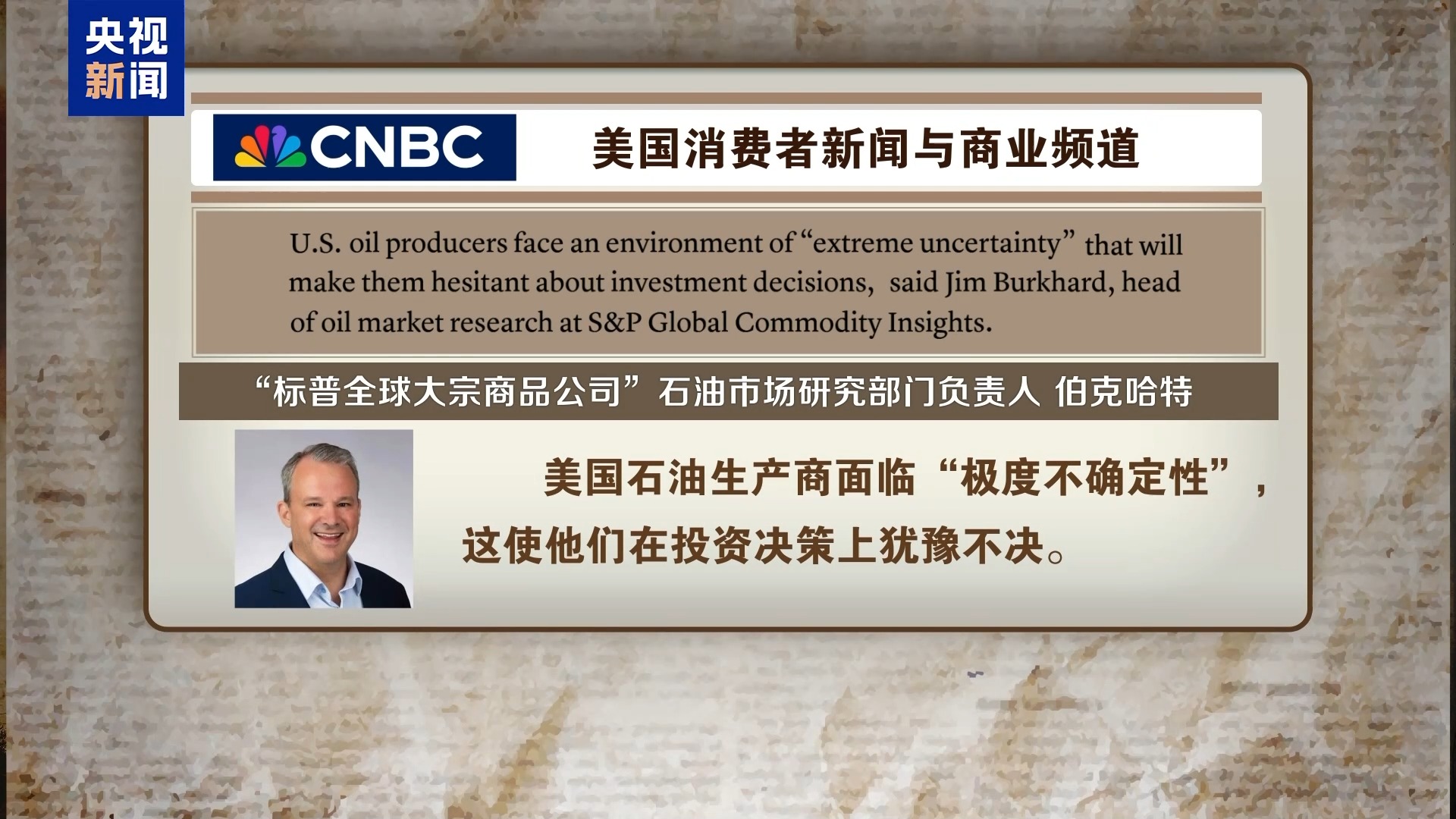 美國消費者新聞與商業(yè)頻道援引“標普全球大宗商品公司”石油市場研究部門負責人伯克哈特的話報道稱,美國石油生產(chǎn)商面臨“極度不確定性”,這使他們在投資決策上猶豫不決。