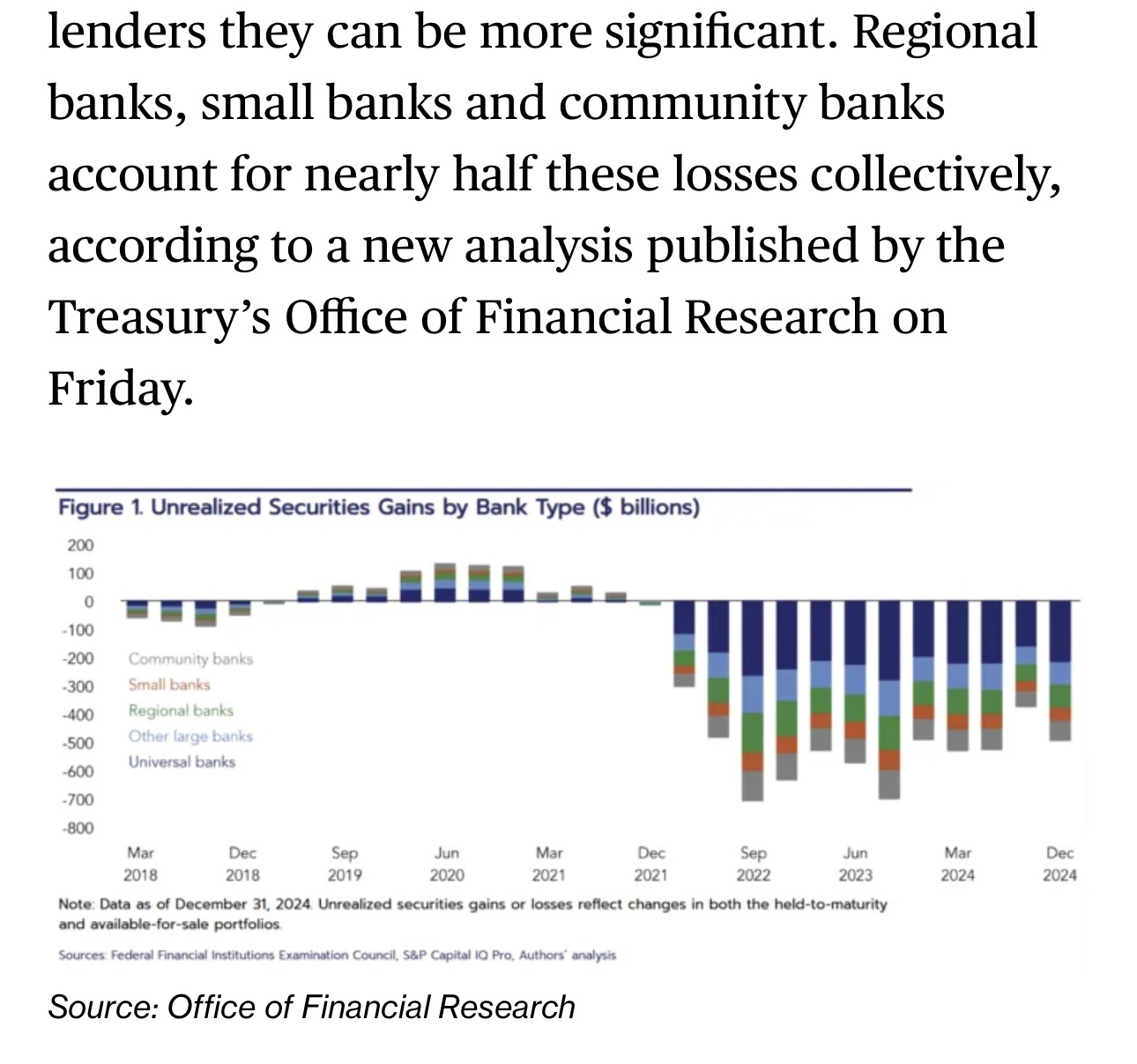 文章回憶道,2022年和2023年,美國國債和抵押貸款債券的“未實現損失”成為貸款機構的一大擔憂,當時利率大幅上升,引發(fā)了以硅谷銀行為首的幾家銀行倒閉?!拔磳崿F損失”,是指在某個資產或證券的市場價值低于其購入價格的情況下,尚未出售或平倉的投資組合中的損失。