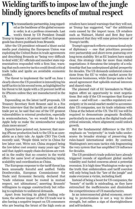 上周,美國總統(tǒng)特朗普威脅稱,自6月1日起將對(duì)歐盟商品征收50%的關(guān)稅。他在社交媒體平臺(tái)發(fā)文,直言不諱地指責(zé)歐盟長期通過貿(mào)易協(xié)定榨取美國,并稱與歐委會(huì)“極難打交道”。歐盟官員隨即強(qiáng)硬回應(yīng),警告稱,此類威脅可能導(dǎo)致至關(guān)重要的貿(mào)易談判破裂,引發(fā)一場本不必要的經(jīng)濟(jì)沖突。