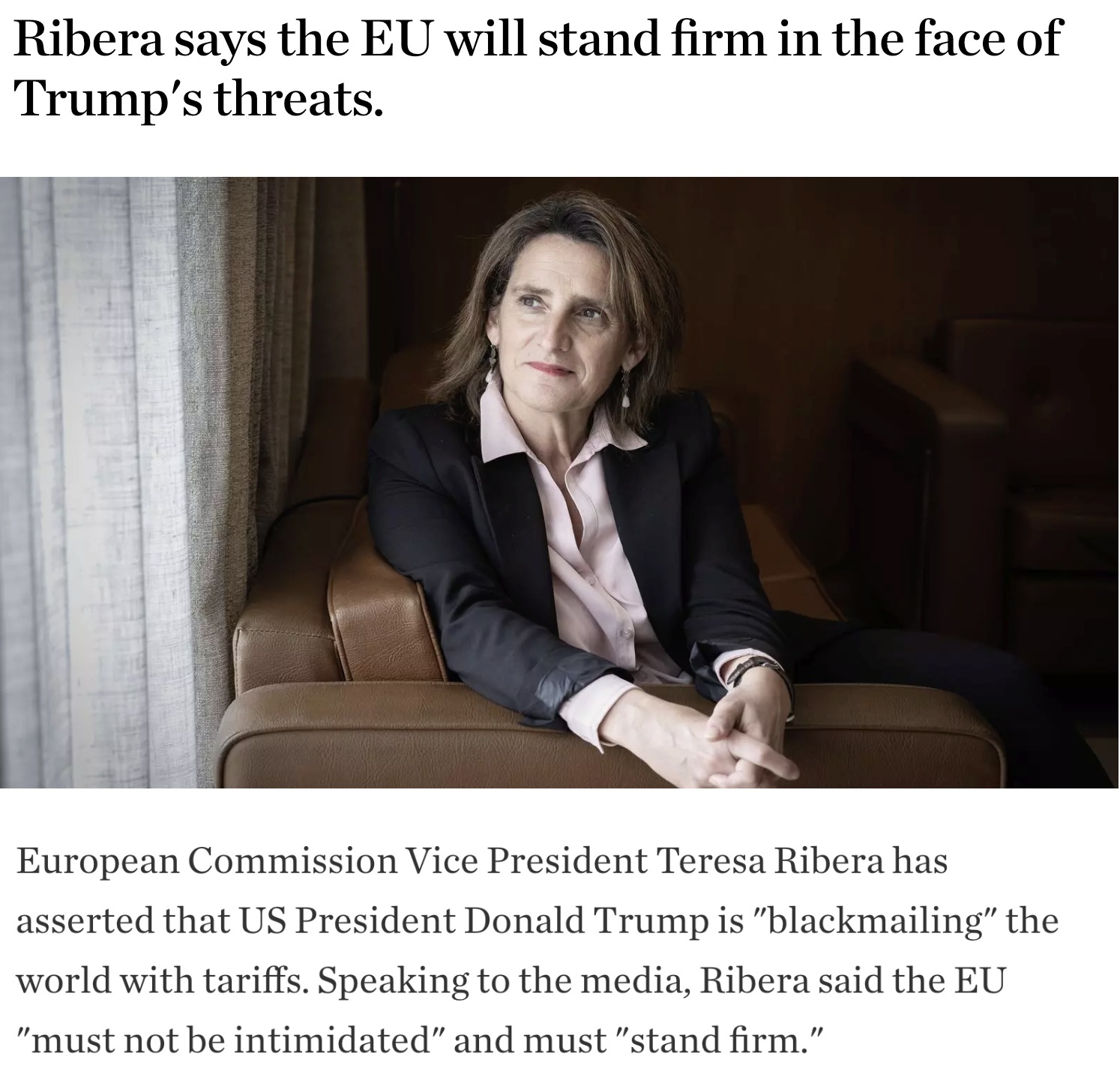 對此,歐盟委員會執(zhí)行副主席里貝拉表示,美方的這種勒索行為是不能容忍的。