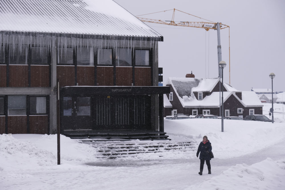2025年3月24日,在丹麥自治領(lǐng)地格陵蘭島首府努克,一名行人經(jīng)過(guò)格陵蘭島自治議會(huì)。新華社記者張玉亮攝