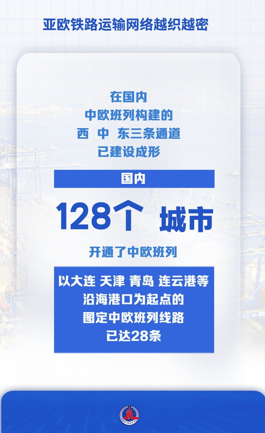 在國(guó)內(nèi),中歐班列構(gòu)建的西、中、東三條通道已建設(shè)成形,國(guó)內(nèi)128個(gè)城市開(kāi)通了中歐班列,以大連、天津、青島、連云港等沿海港口為起點(diǎn)的圖定中歐班列線路已達(dá)28條。