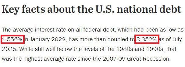 △美國皮尤研究中心的調(diào)查顯示,美聯(lián)邦債務(wù)的平均利率在美聯(lián)儲激進(jìn)加息前的2022年1月曾低至1.556%,而到今年7月已翻了一倍多,達(dá)到3.352%,也是自2007-2009年大衰退以來的最高平均利率水平。