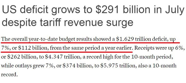 而從本財(cái)年(2024年10月1日至2025年9月30日)的整體情況來看,在截至7月的前十個(gè)月,美政府累計(jì)財(cái)政赤字已達(dá)1.63萬億美元,同比增長了7%。
