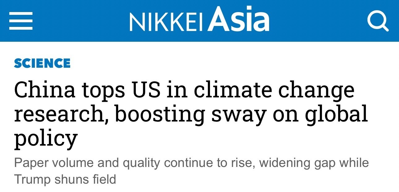 《日經(jīng)亞洲評(píng)論》22日發(fā)布的一篇文章指出,中國在2023年發(fā)表的氣候變化研究論文數(shù)量超過了美國,并在次年擴(kuò)大了領(lǐng)先優(yōu)勢(shì)。這一趨勢(shì)凸顯了中國全球影響力的持續(xù)增長(zhǎng),與此同時(shí),美國卻在逐漸退出這一領(lǐng)域。
