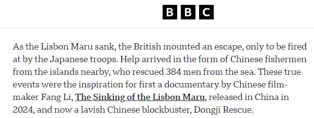 文章最后說,電影《東極島》將于8月22日在英國和美國上映;紀(jì)錄片《里斯本丸沉沒》目前正在英國通過奧德賽中文電影頻道網(wǎng)站播放,以紀(jì)念中國人民抗日戰(zhàn)爭暨世界反法西斯戰(zhàn)爭勝利80周年。