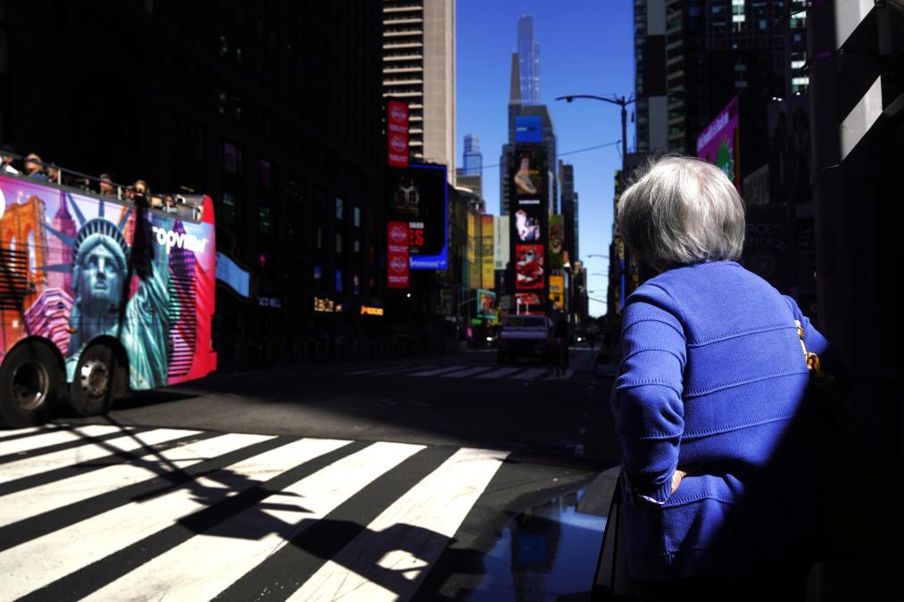 10月1日,在美國紐約曼哈頓的時(shí)報(bào)廣場附近,行人等待通過人行橫道斑馬線過馬路。新華社記者 吳曉凌 攝