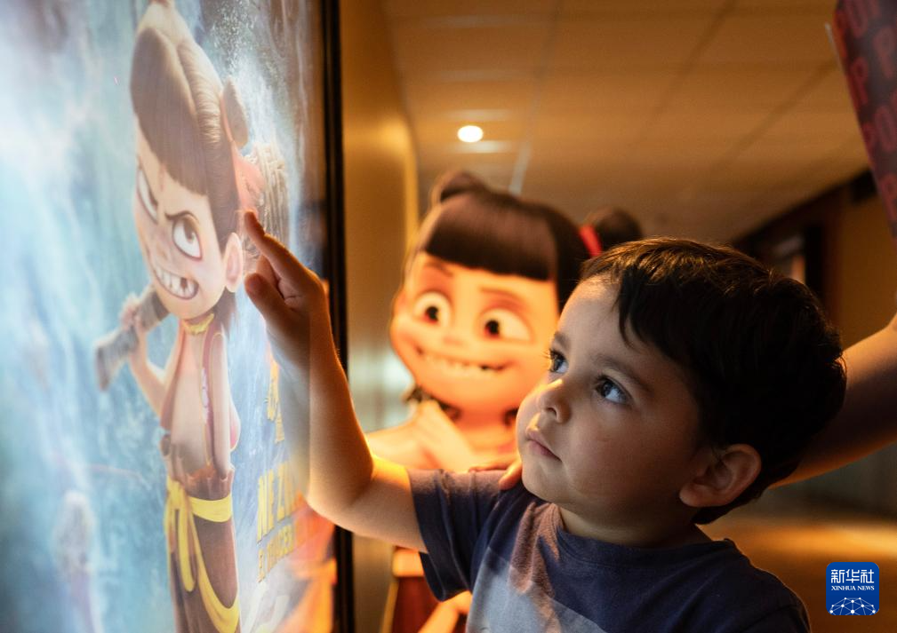 10月2日,一名男孩在阿根廷首都布宜諾斯艾利斯的一家電影院觀看《哪吒2》海報(bào)。新華社發(fā)(馬丁·薩巴拉攝)