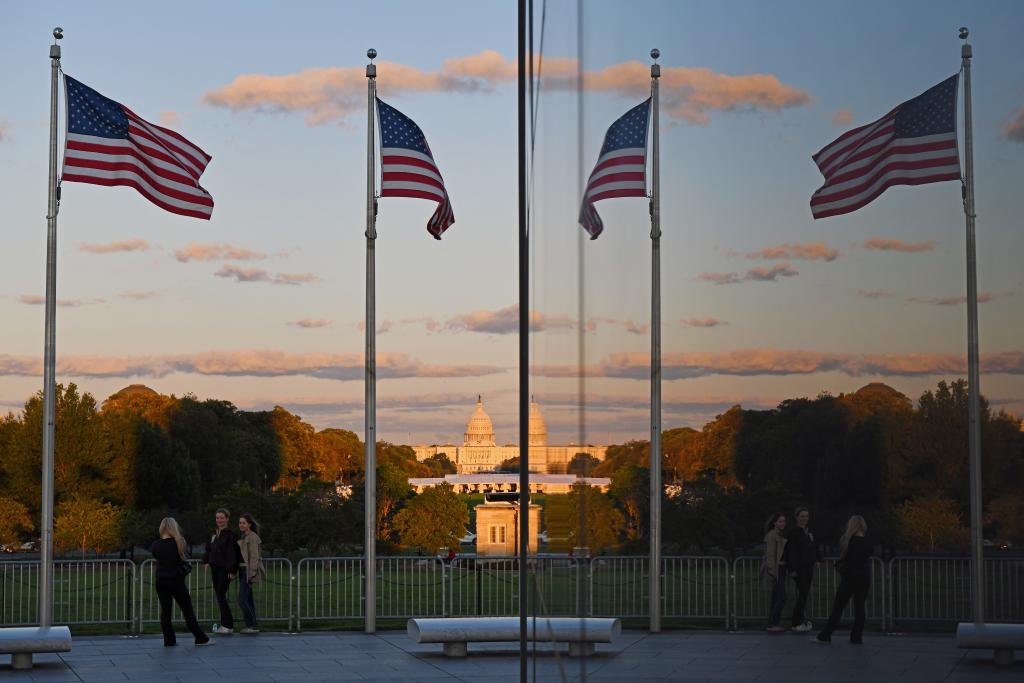 10月8日,在美國(guó)華盛頓,人們以國(guó)會(huì)大廈為背景留影。新華社記者李睿攝