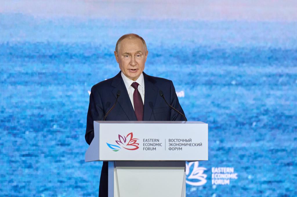 9月5日,俄羅斯總統(tǒng)普京在符拉迪沃斯托克出席第十屆東方經(jīng)濟(jì)論壇全體會(huì)議時(shí)發(fā)表講話。新華社發(fā)(郭飛洲攝)