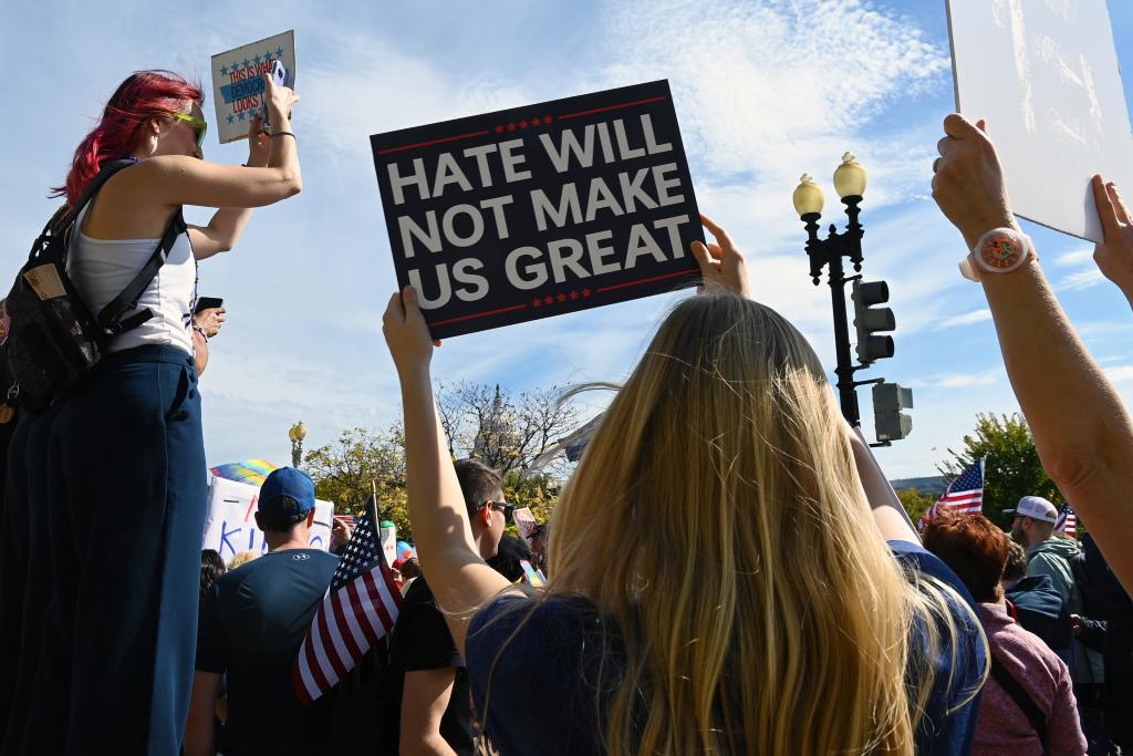 10月18日,在美國華盛頓,人們參加示威游行活動。新華社記者李睿攝