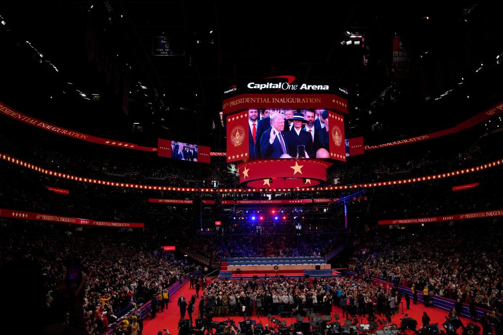 1月20日,在美國(guó)首都華盛頓第一資本體育館,人們觀看美國(guó)第47任總統(tǒng)就職典禮的轉(zhuǎn)播。新華社記者吳曉凌攝