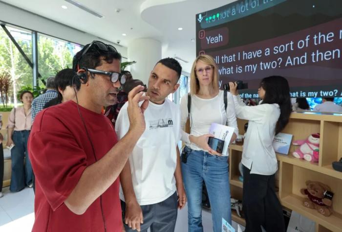2025年9月29日,在“外國記者走進北京”——經(jīng)開區(qū)專題推介活動上,外國記者佩戴自動翻譯眼鏡。中新社記者 賈天勇 攝