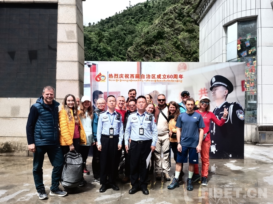 圖為聶拉木邊檢站民警與樟木口岸首批免簽入境的俄羅斯旅客合影