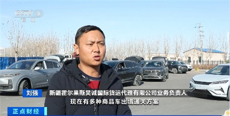 新疆霍爾果斯昊誠(chéng)國(guó)際貨運(yùn)代理有限公司業(yè)務(wù)負(fù)責(zé)人 劉強(qiáng):現(xiàn)在有多種商品車(chē)出境通關(guān)方案可供選擇,包括本地報(bào)關(guān)、一體化申報(bào)、直通轉(zhuǎn)關(guān)等多種模式。今年我們公司共出口商品車(chē)1500余輛,貿(mào)易額超3億元。