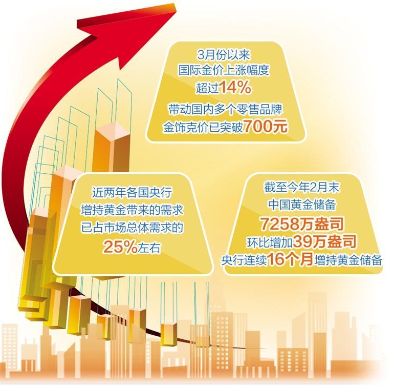 東方金誠首席宏觀分析師王青認為,以美元計價的國際金價持續(xù)攀升有三方面原因:一是當前正處于美聯(lián)儲降息的預期升溫階段,黃金需求增加是正常的市場反應;二是年初以來多國央行仍在繼續(xù)增持黃金,地緣政治風險的上升及全球貿(mào)易環(huán)境的高不確定性,讓各國央行更加重視黃金儲備,數(shù)據(jù)顯示,近兩年各國央行增持黃金帶來的需求已占市場總體需求的25%左右;三是今年春節(jié)以來,國內(nèi)民眾購金熱情高漲,除了季節(jié)性消費需求釋放外,也與資本市場波動性加大、黃金投資屬性凸顯等因素有關。