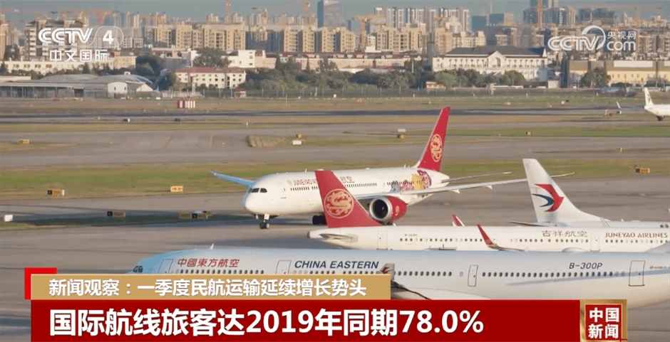 客運(yùn)方面,全行業(yè)一季度共完成旅客運(yùn)輸量接近1.8億人次,為歷年一季度客運(yùn)量最高值,同比增長37.7%,較2019年同期增長10.2%。其中,國內(nèi)航線完成1.6億人次,規(guī)模較2019年同期增長14.3%;國際航線完成1412.0萬人次,規(guī)?;謴?fù)至2019年同期的78.0%。