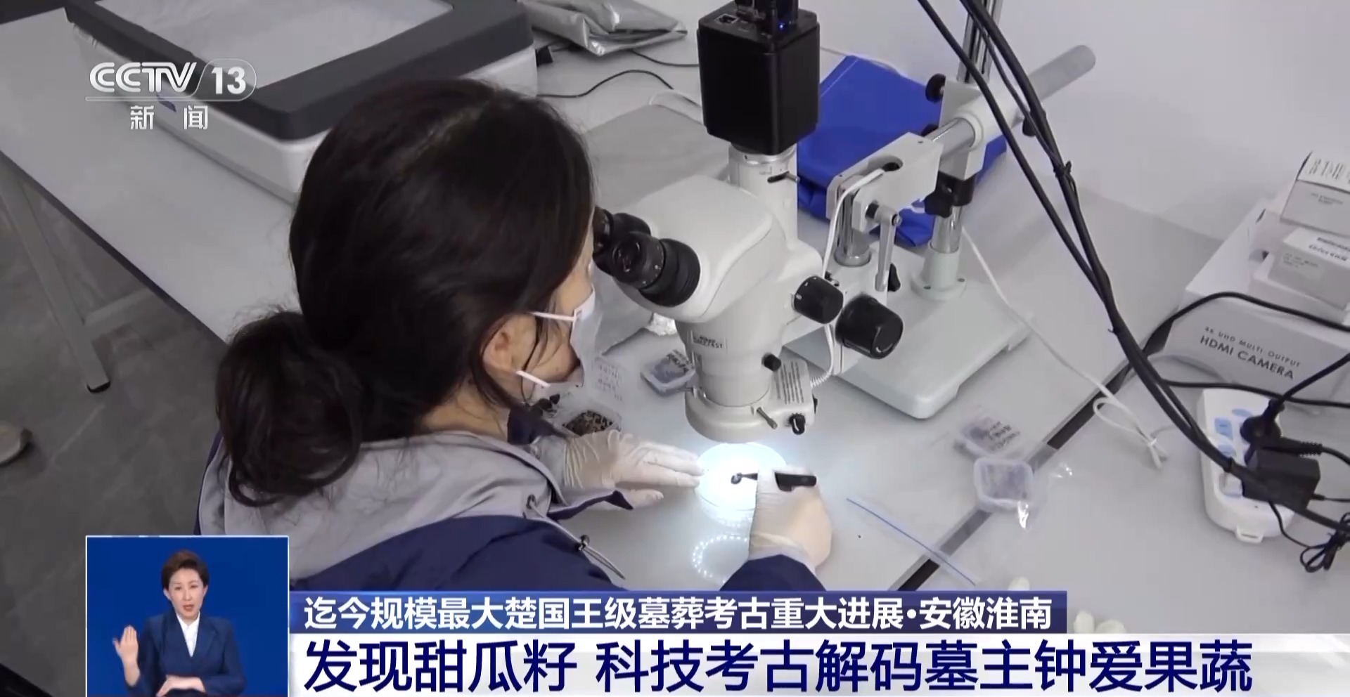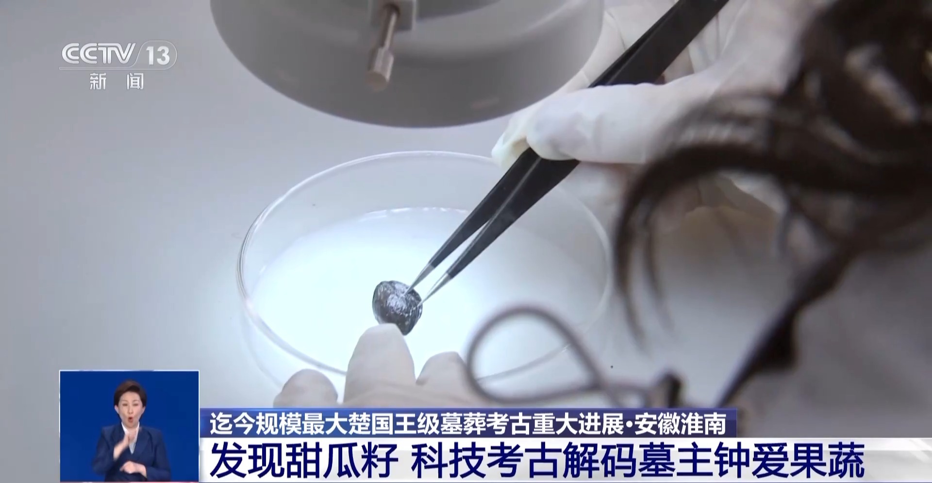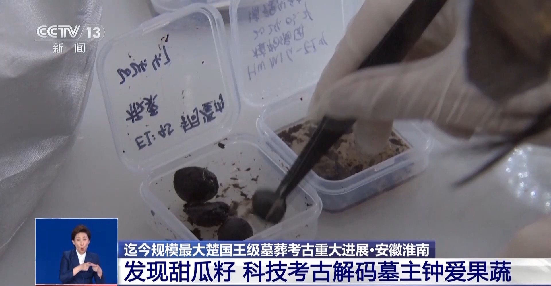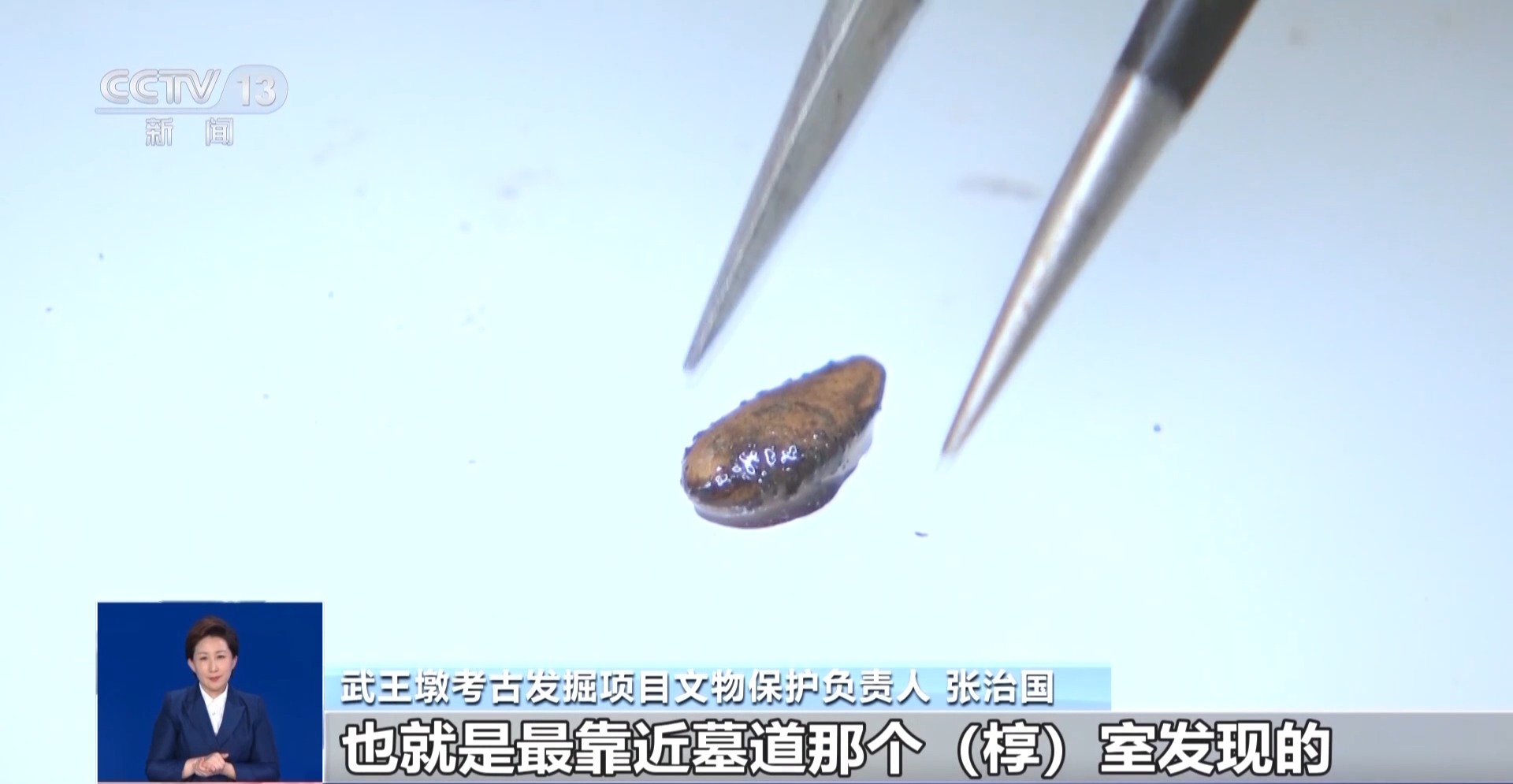 武王墩考古發(fā)掘項(xiàng)目文物保護(hù)負(fù)責(zé)人 張治國:發(fā)現(xiàn)大部分的這個(gè)里面都是一些樹葉,然后還有果核,可能還有一些草編的痕跡,目前初步鑒定出來的有甜瓜籽,然后還有一些梅核。