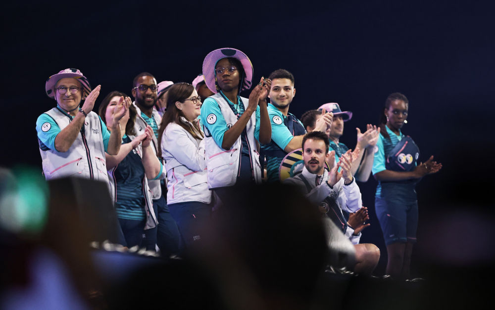 3月23日,模特在巴黎奧運會志愿者大會上展示志愿者制服。新華社記者 高靜 攝