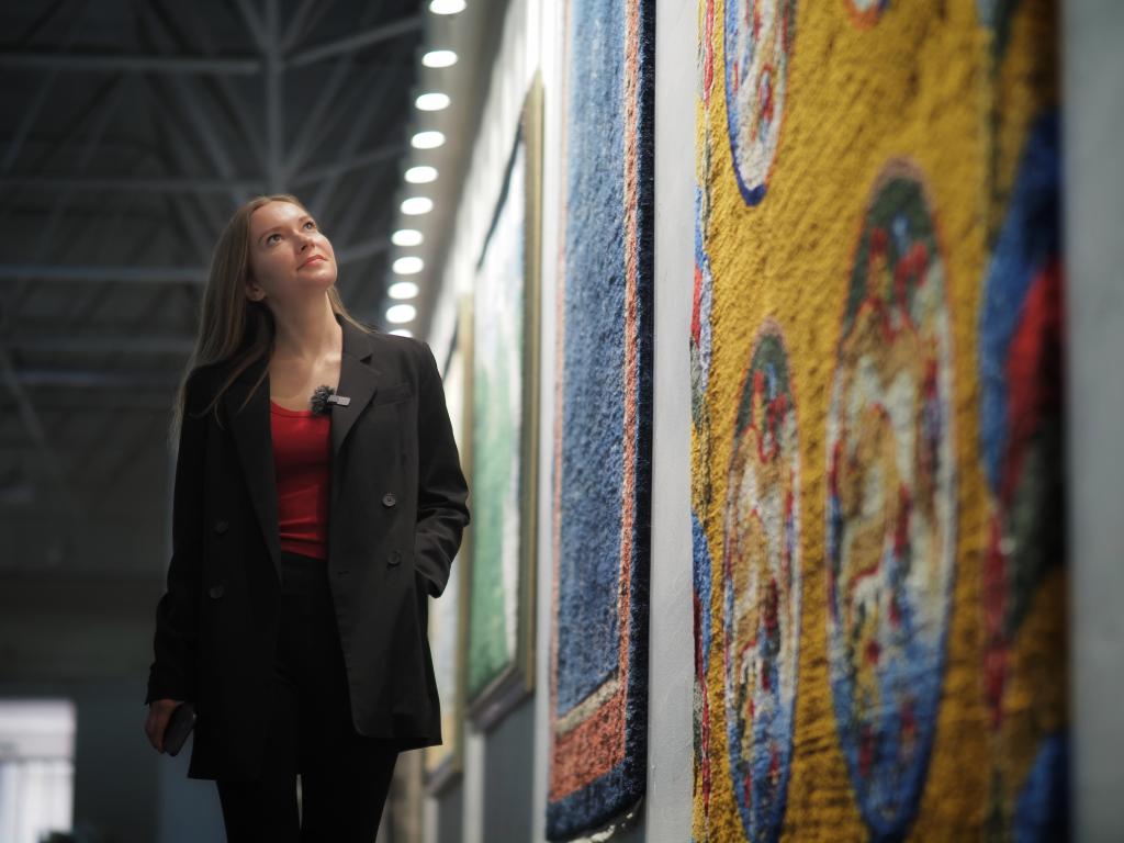 2024年3月20日,新華社外籍記者達(dá)莎在西寧市圣源地毯集團生產(chǎn)車間參觀。新華社記者趙宇攝