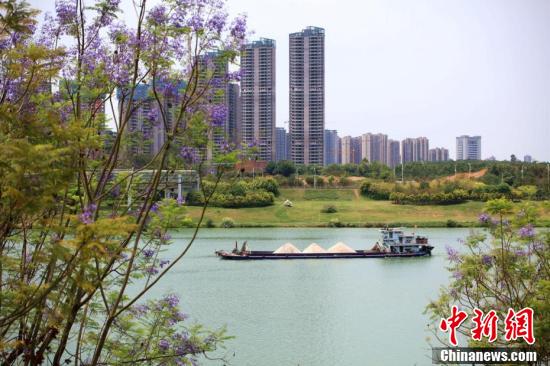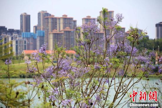近日,廣西南寧市藍花楹盛開,藍紫色彩為城市增添了一道浪漫美景。