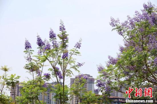 近日,廣西南寧市藍花楹盛開,藍紫色的花朵在風中搖曳生姿。