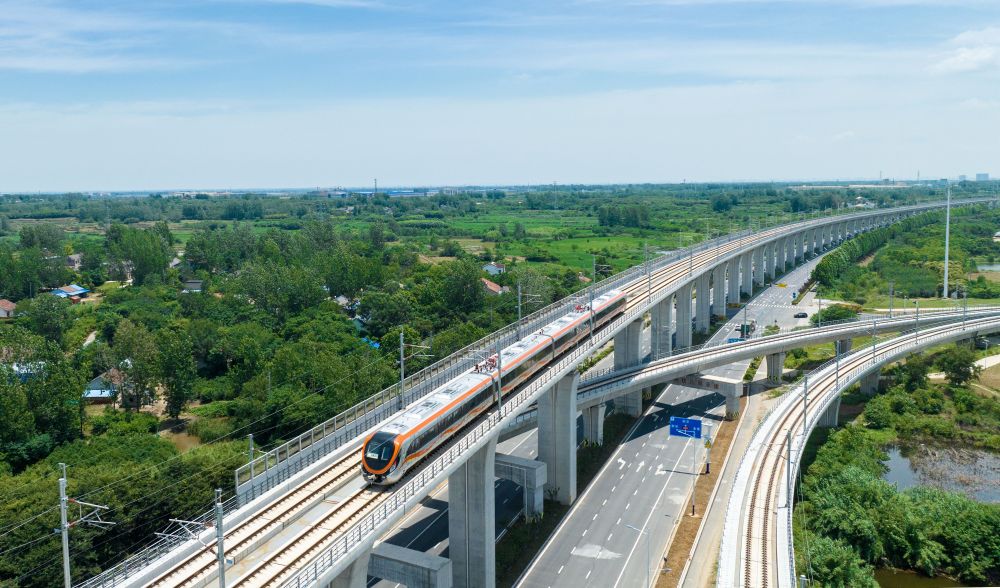 這是在滁州市拍攝的滁寧城際鐵路列車(chē)(2023年6月28日攝,無(wú)人機(jī)照片)。新華社記者 劉軍喜 攝