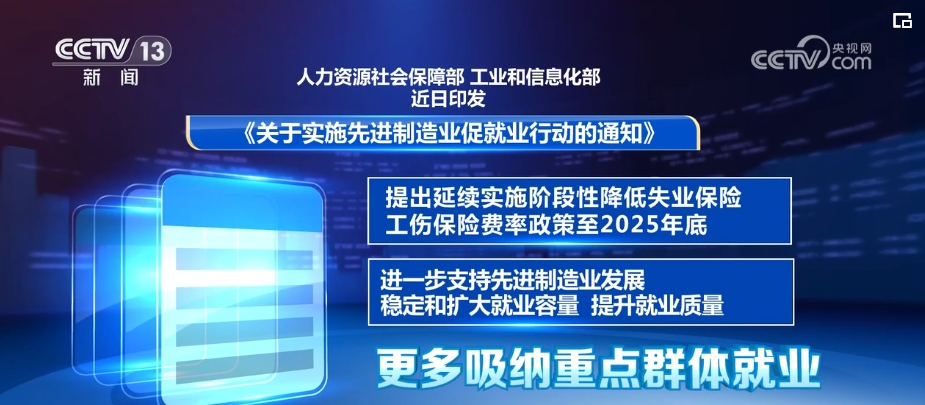 人力資源社會保障部、工業(yè)和信息化部印發(fā)《關(guān)于實施先進制造業(yè)促就業(yè)行動的通知》,提出延續(xù)實施階段性降低失業(yè)保險、工傷保險費率政策至2025年底,進一步支持先進制造業(yè)發(fā)展,穩(wěn)定和擴大就業(yè)容量,提升就業(yè)質(zhì)量,更多吸納重點群體就業(yè)。