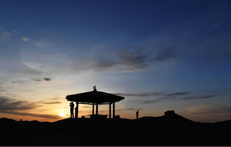 傍晚,游客在陽關(guān)拍攝大漠落日景色。新華社記者 陳斌 攝