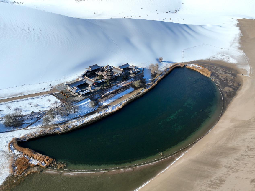 敦煌鳴沙山月牙泉景區(qū)雪景(無人機(jī)照片)。新華社發(fā)(張曉亮 攝)