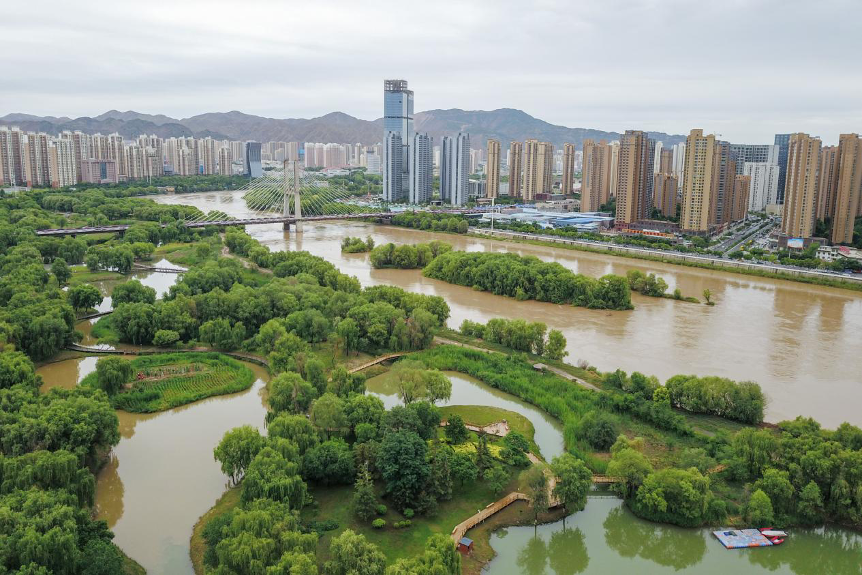 甘肅省蘭州市拍攝的銀灘濕地公園景色(無人機(jī)照片)。新華社記者 范培珅 攝