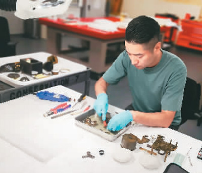 亓昊楠在修復(fù)1900年的火車頭式鐘表。香港故宮文化博物館供圖