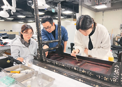 京港修復(fù)師共同為明代黑漆嵌螺鈿桌案進(jìn)行“會診”?!∠愀酃蕦m文化博物館供圖