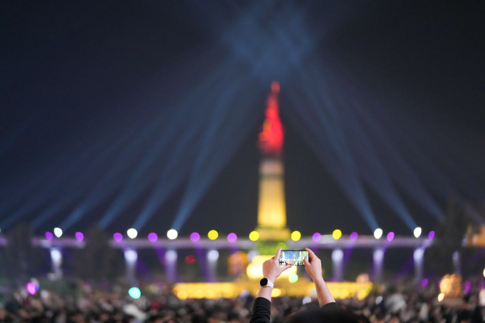 5月3日,人們?cè)诠枮I防洪紀(jì)念塔廣場(chǎng)觀賞光影秀。