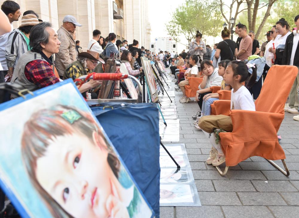 5月1日,游客在哈爾濱中央大街上畫(huà)肖像畫(huà)。新華社發(fā) (劉洋攝)