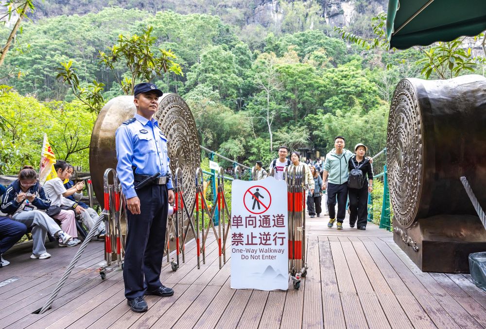 5月1日,民警在貴州省安順市黃果樹(shù)瀑布景區(qū)執(zhí)勤。新華社發(fā)(陳熙 攝)