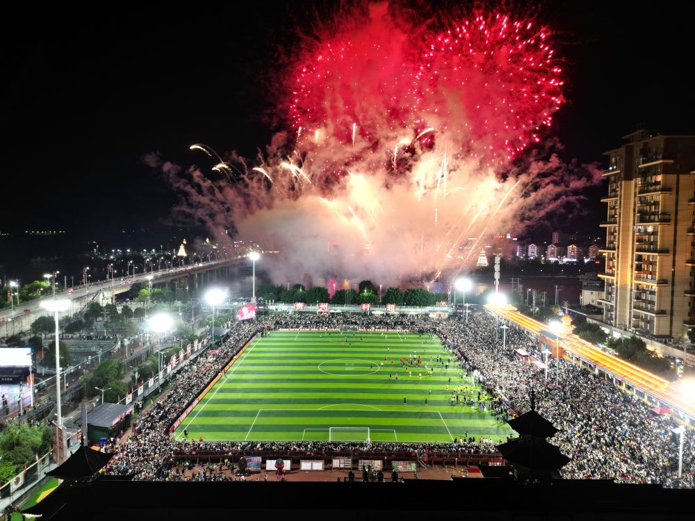 5月4日,游客在貴州省黔東南苗族侗族自治州榕江縣“村超”球場(chǎng)比賽結(jié)束后欣賞焰火表演(無(wú)人機(jī)照片)。新華社發(fā)(王炳真 攝)