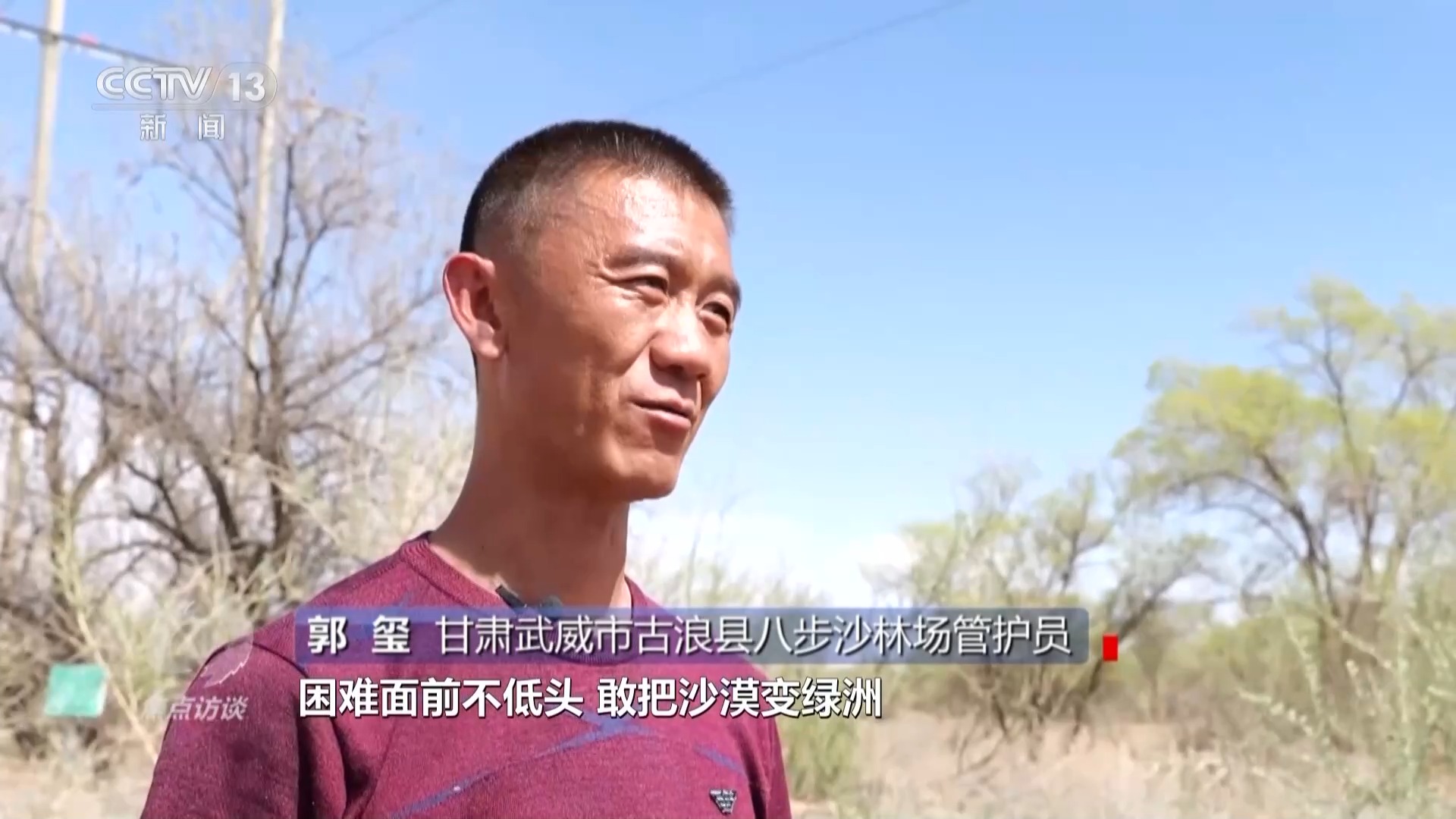 甘肅武威市古浪縣八步沙林場(chǎng)管護(hù)員 郭璽:總書記跟我說,困難面前不低頭,敢把沙漠變綠洲。我們要一代一代傳承下去,我爺爺他們幾十年種下的樹不能到我們手里死掉。