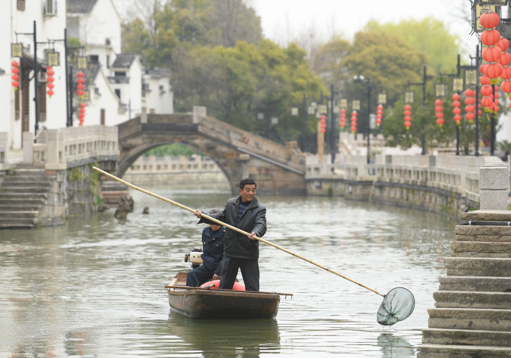2023年3月16日,在太湖畔的浙江省湖州市織里鎮(zhèn)義皋村,保潔員在清理河道。多年來的溇港整治使得太湖周邊河道水質明顯改善,也為鄉(xiāng)村旅游注入動力。新華社記者 翁忻旸 攝