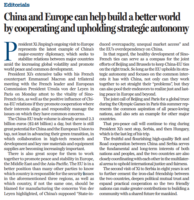 中國領(lǐng)導(dǎo)人此次歐洲之行旨在全球局勢日益動蕩之際穩(wěn)定大國關(guān)系和中歐關(guān)系,促進世界和平與共同發(fā)展。在促進歐洲、中東和亞太地區(qū)的和平與穩(wěn)定方面,中歐雙方有很大的合作空間。只要歐盟堅持戰(zhàn)略自主,著眼于中歐共同利益,雙方不僅可以攜手合作,還可以為實現(xiàn)歐洲和歐洲以外地區(qū)公正與持久的和平共同努力,為世界和平與發(fā)展以及人類的進步作出新的貢獻。