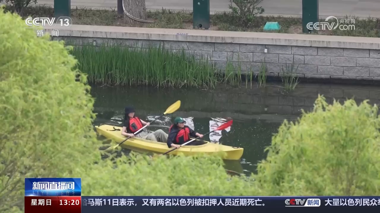 在北京朝陽區(qū)亮馬河畔水清岸綠,垂釣、散步、劃槳板的游人絡(luò)繹不絕,享受假日時光。